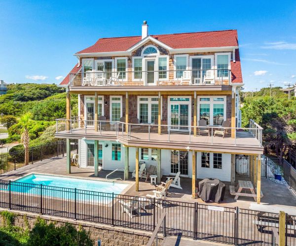 Neptune is a beautiful oceanfront vacation rental perfect for multigenerational vacations or family reunions. Located in Atlantic Beach, NC, this recently constructed home features 8 bedrooms with five primary suites. The spacious gourmet kitchen offers all the comforts of home and more and there’s plenty of seating to enjoy movie night with the whole family in the surround-sound theater room. There’s also a large recreation room with a wet bar, pool table and huge Smart TV. The fenced back yard features a gazebo and spacious patio areas that surround the oceanfront pool. Enjoy magnificent views of the ocean shoreline, from Emerald Isle to Cape Lookout, on the large covered and open decks. View more photos of Neptune and start planning your family reunion today!