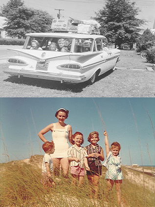 Julia Batten Wax recalls Jim and Mary loading up the family station wagon and Dave, Guinn, Julia and cousin Nancy heading to Emerald Isle to spend the summers with Aunt Mildred, helping in every way she could in the office.