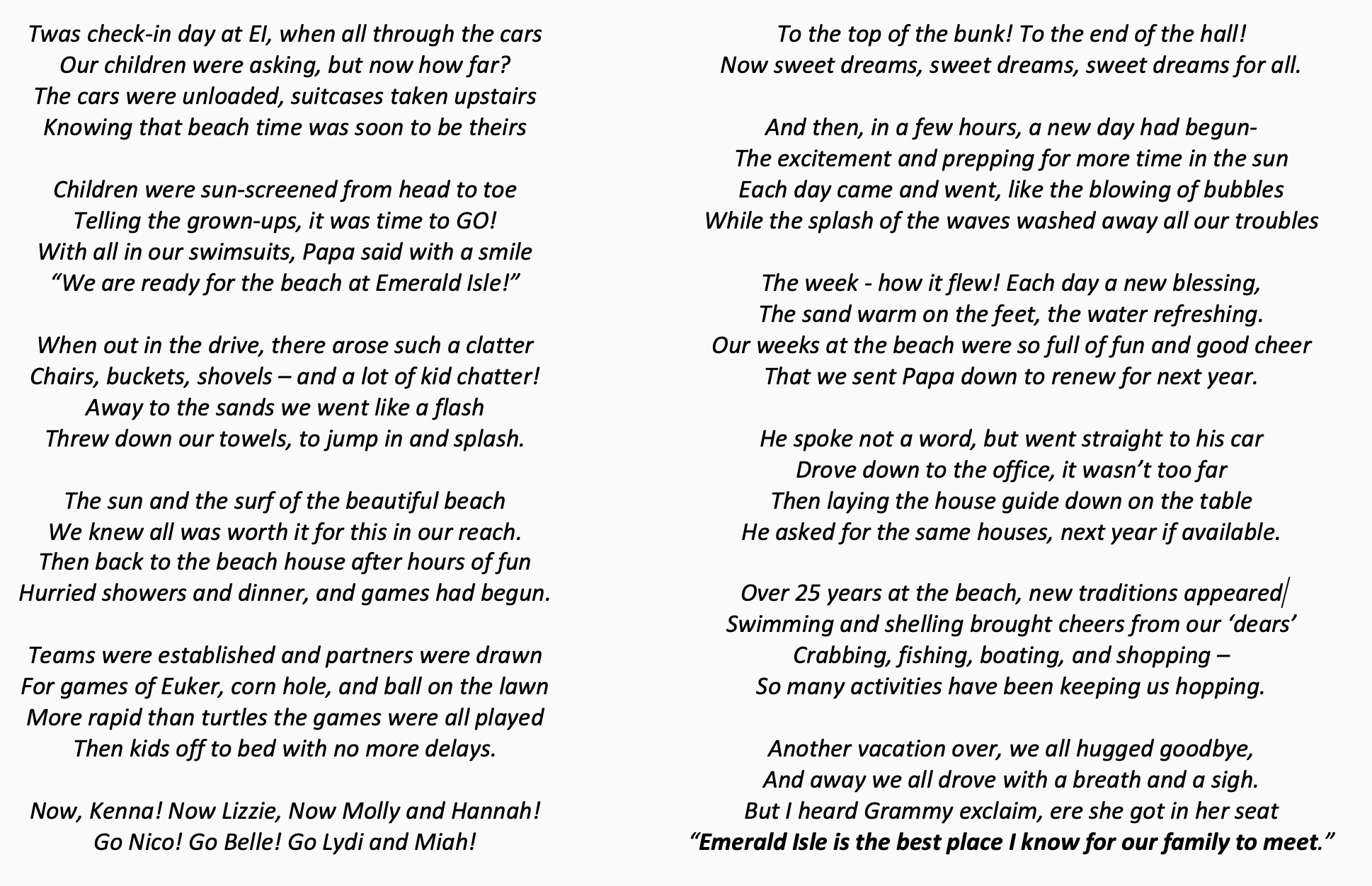 About 10 years ago, the girl cousins began producing a performance each year, planning short skits or songs from musicals. This year, these cousins, now in high school, offered an opportunity for the “audience” to share memories of the last 25 years at EI. Everyone shared. Every time someone shared, it reminded someone else of something. Memories included observing the release of baby sea turtles, ladies’ day outings, burying kids in the sand, crabbing, deep sea fishing, shelling, and on and on. Emerald Isle has been such an important part of our family history. These weeks have kept me close with my siblings and enabled the cousins to become best friends. It is the thing each one of us looks forward to all year long, and we feel blessed to have continued this tradition for 25 years. In thanksgiving to my dad, whom we call Papa and my mom, whom we all call Grammy, my sister and I wrote this adaptation of the classic Clement C. Moore poem, “Twas the Night Before Christmas.”